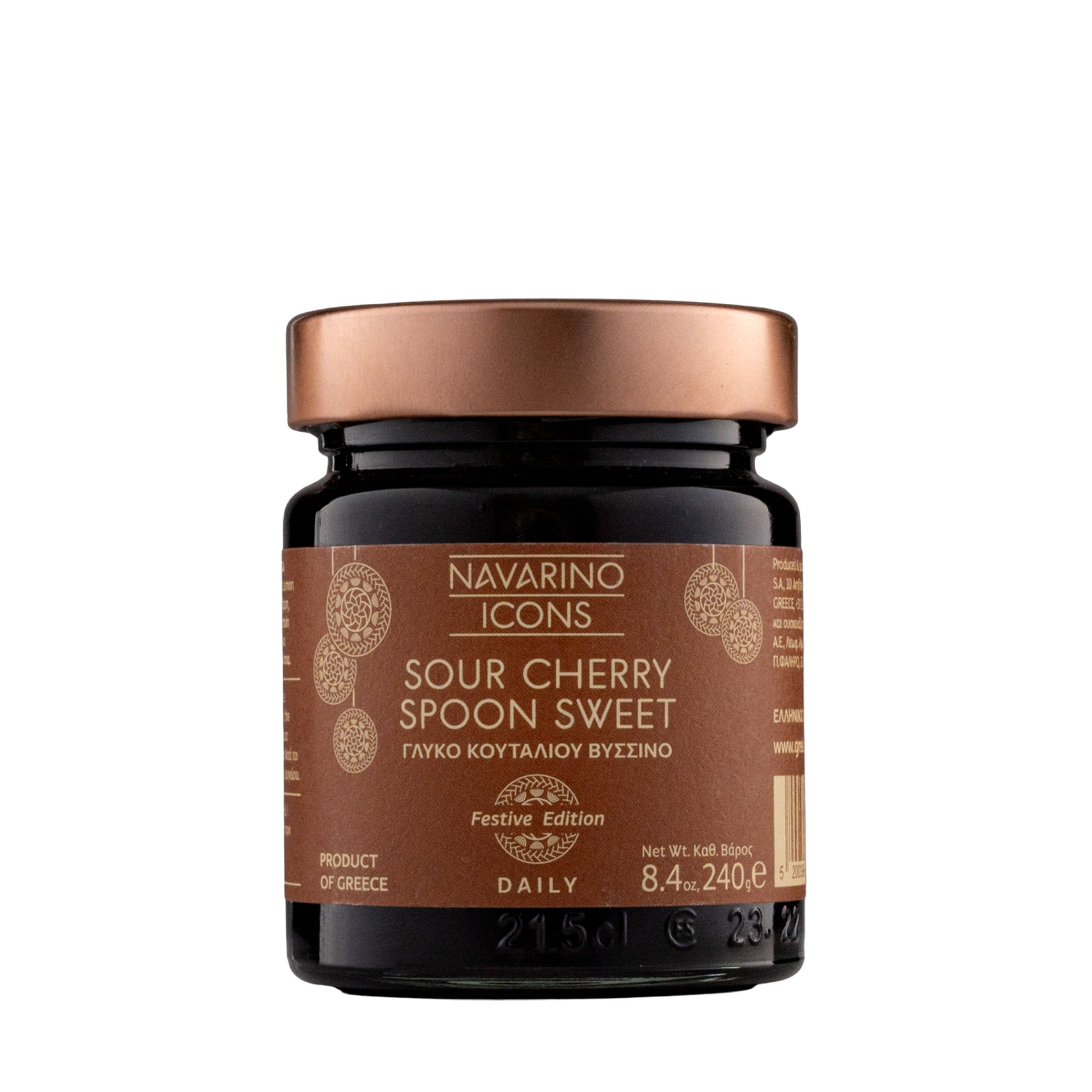 Un "glyko koutaliou" (dulce de cuchara) es un dulce tradicional griego, profundamente arraigado en la cultura de la hospitalidad (phoxenia). Consiste en fruta entera o en trozos grandes conservada en un almíbar espeso. El nombre proviene de la costumbre de servirlo a los invitados en una cucharilla pequeña y ornamentada con un vaso de agua fría. A diferencia de la mermelada, la fruta se mantiene firme y nítida. Este dulce de cereza ácida Navarino Icons (Vissino) es un ejemplo clásico, que muestra la integridad de la fruta y su vibrante sabor agridulce.