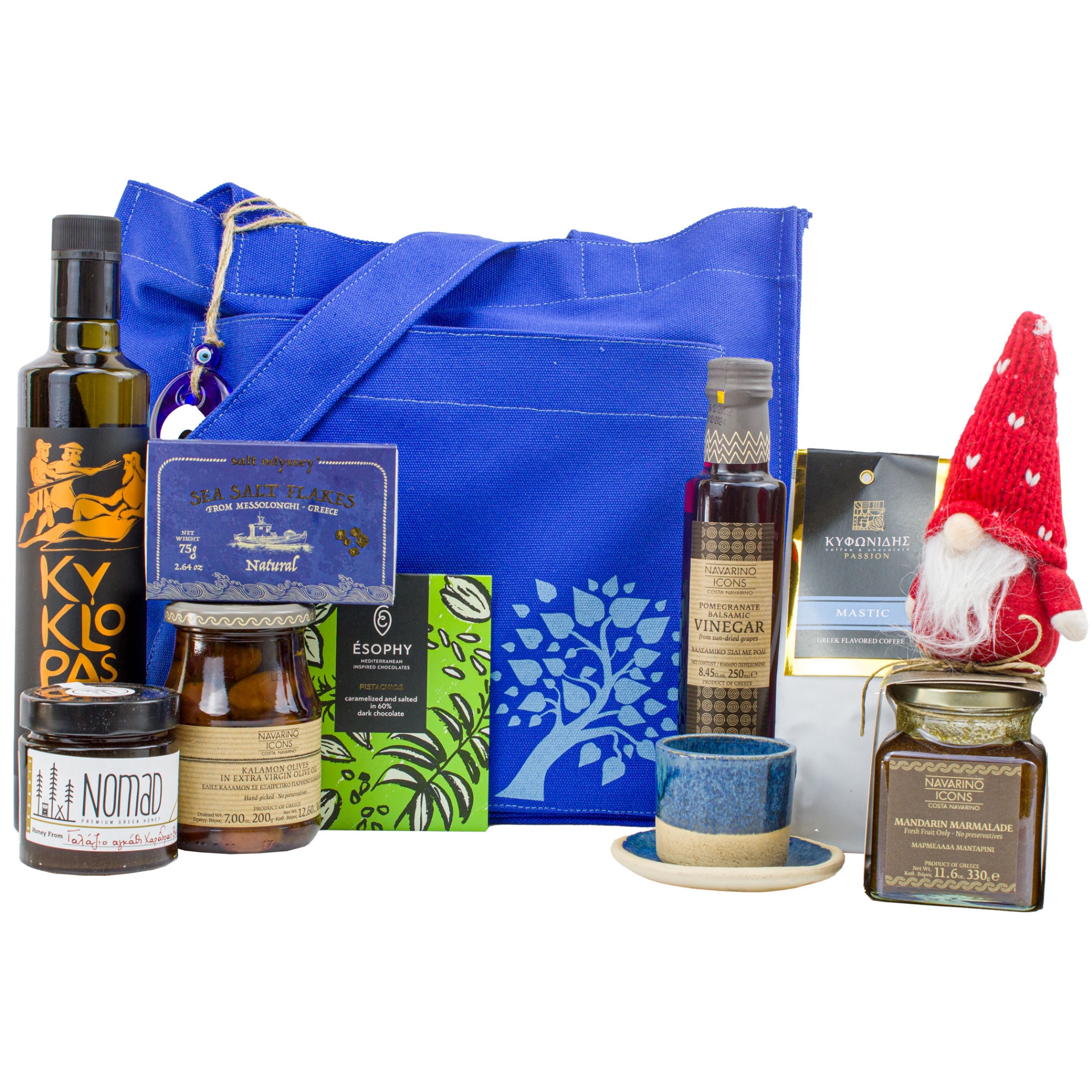 Descubre la mejor caja de regalo griega para estas fiestas. Nuestra cesta "Canción de Navidad" incluye una cuidada selección de productos artesanales como aceitunas Navarino Icons y miel Mouriki. El regalo gourmet perfecto y personalizable.