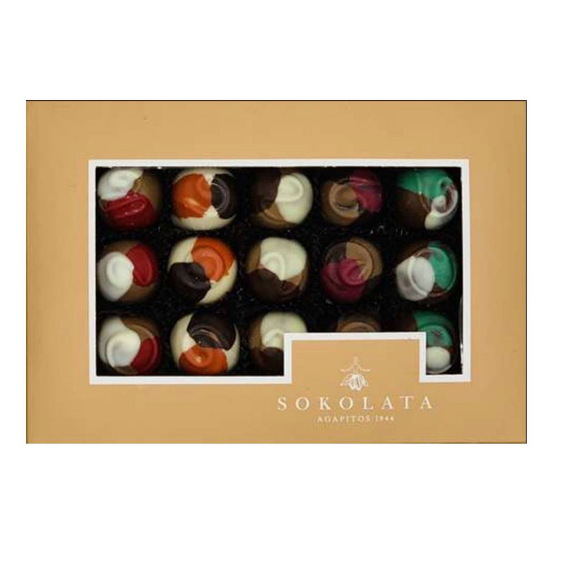 Déjate llevar por la Colección Mundial Sokolata Agapitos 1944. Esta caja de 15 bombones de lujo contiene chocolates artesanales griegos hechos a mano, perfectos para regalos gourmet y envíos internacionales.